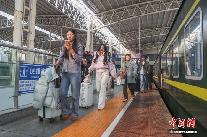 12月31日,江东北昌站,搭客道同砚坐正在车箱里,她战同伙绸缪搭车前去江西鹰潭玩耍。中新社记者 刘力鑫 摄