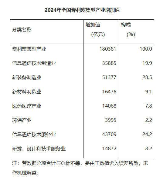 2024年全国专利密集型产业增加值为180381亿元